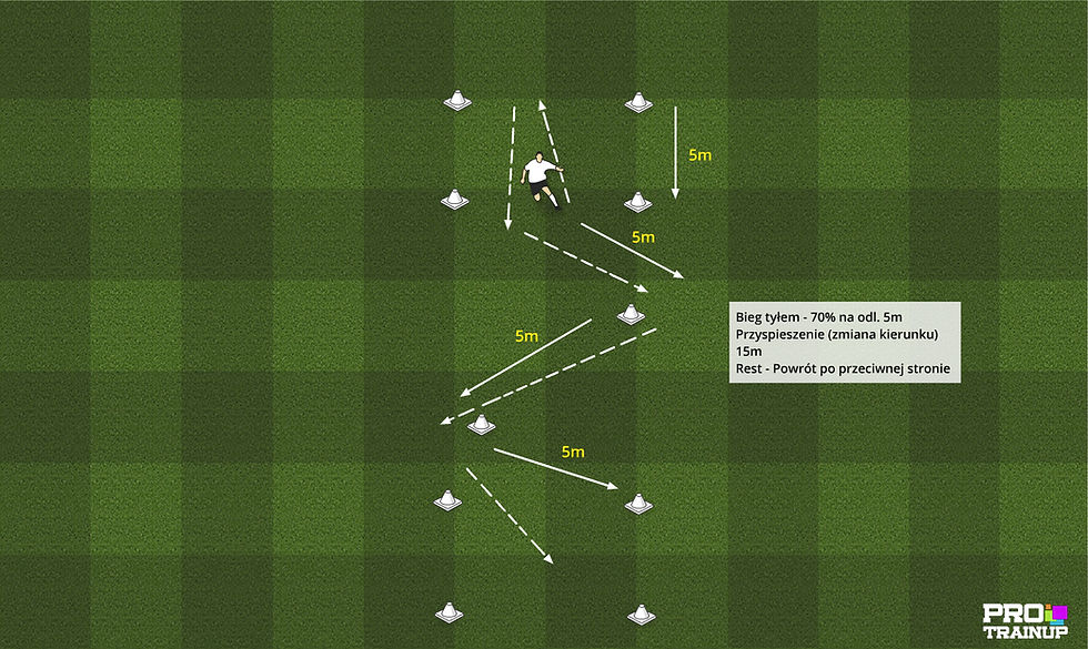 Wykonuje sprinty na różnych dystansach łącząc to z prowadzeniem piłki, pracą w obronie, dojście do pressingu - mieszając to z biegiem sub-maksymalnym.
